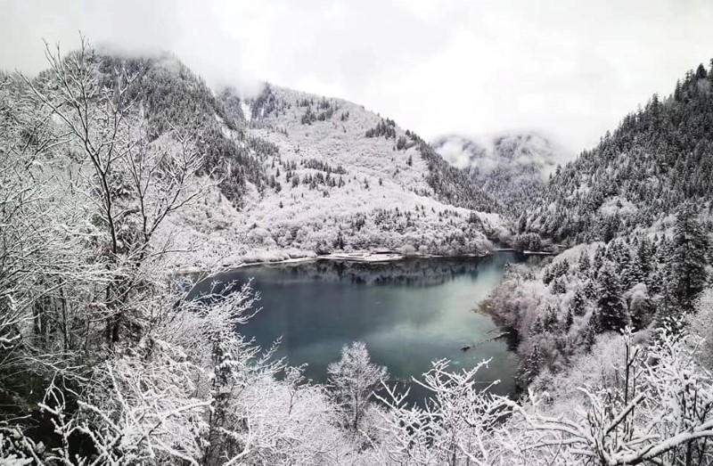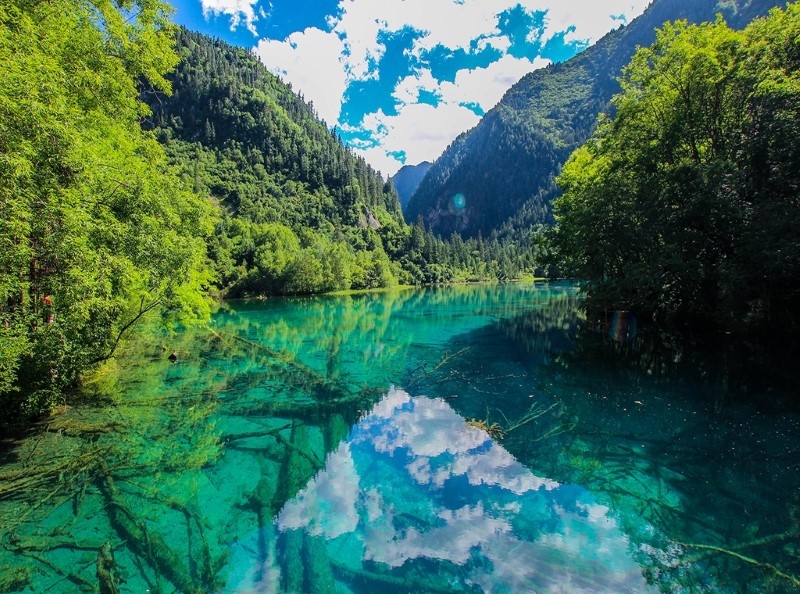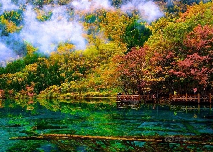 Cửu Trại Câu không cần dùng lời để kể chuyện. Chỉ cần ngắm nhìn Ngũ Hoa Hải – nơi lòng hồ trong vắt như pha lê, ẩn hiện những thân cây cổ mục nằm yên dưới đáy, và từng lớp rêu, từng cánh lá như đang trôi giữa giấc mộng – ta đã thấy thiên nhiên tự tay họa nên một bức tranh huyền diệu không thực mà cũng chẳng hư. Thác Nuorilang, như một dải lụa bạc đổ xuống từ trời, tung bọt trắng xóa giữa nền xanh đại ngàn. Tiếng nước đổ chẳng ồn ào mà ngân nga như khúc ngâm cổ tích, khiến lòng người lữ khách lặng đi, nghe núi rừng kể lại những câu chuyện của hàng nghìn năm trước.